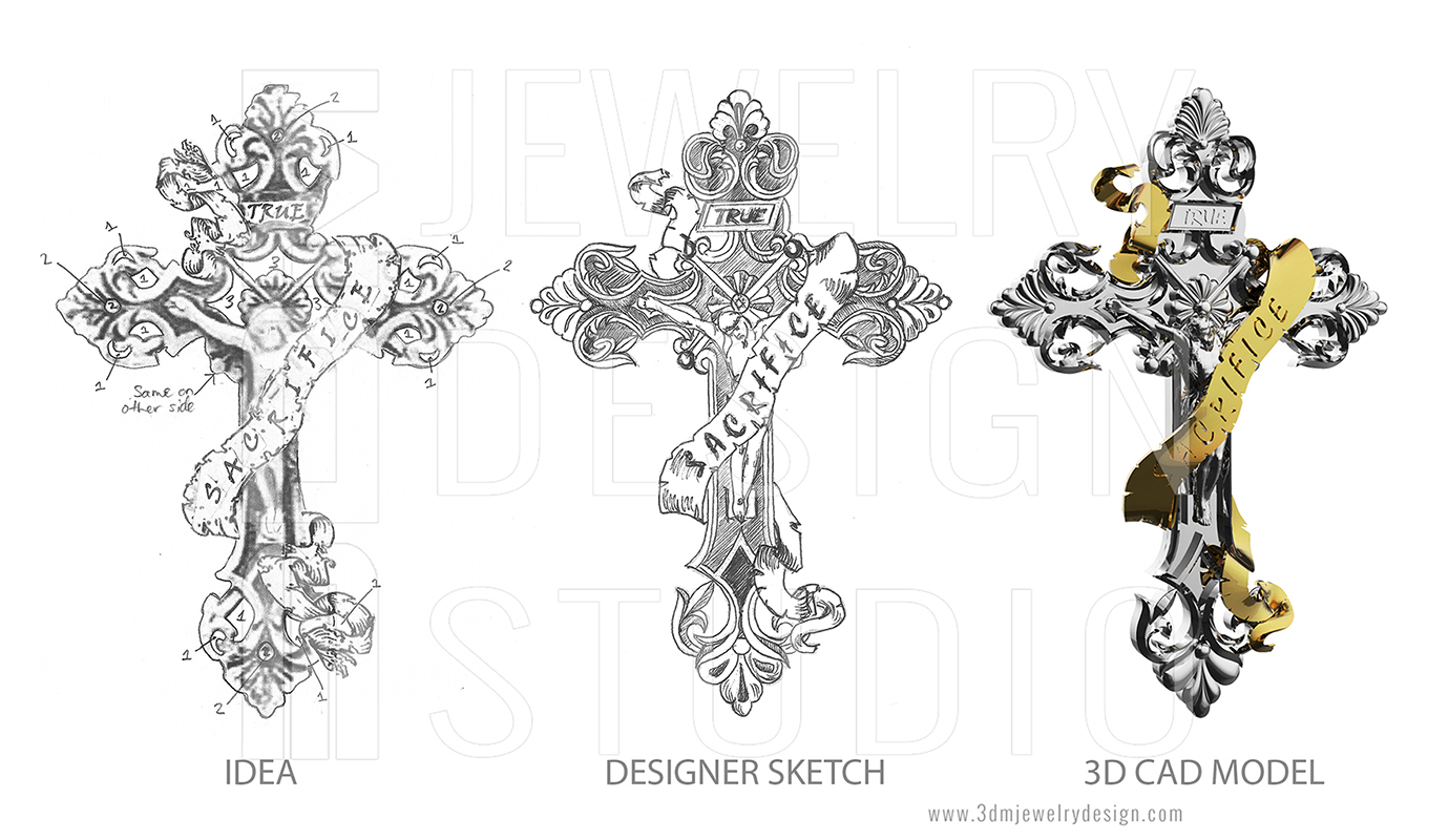 Cross pendant development transformation from sketch to finished jewelry design render by 3DM jewelry design studio.